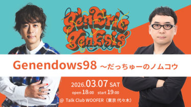 ミラッキ(大村綾人)が活動するトークユニット「genEric genEsis」によるトークイベントを開催いたします。Genendows98 ~だっちゅーのノムコウ日時:2026年3月7日(土) open18:00/start19:00会場:...